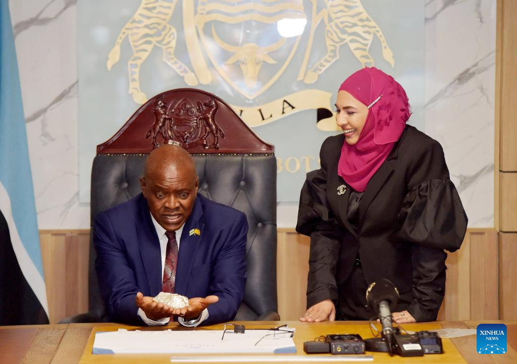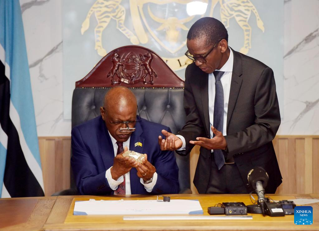 GABORONE, 23 agosto, 2024 (Xinhua) -- Imagen del 22 de agosto de 2024 del presidente botsuano, Mokgweetsi Masisi, inspeccionando el diamante de 2.492 quilates descubierto en la Mina de Diamantes de Karowe en el centro-norte de Botsuana, en Gaborone, Botsuana. El descubrimiento de un diamante de 2.492 quilates fue anunciado por Lucara Diamond Corp. el miércoles. Fue el diamante más grande jamás descubierto en Botswana y el segundo más grande del mundo. (Xinhua/Tshekiso Tebalo)