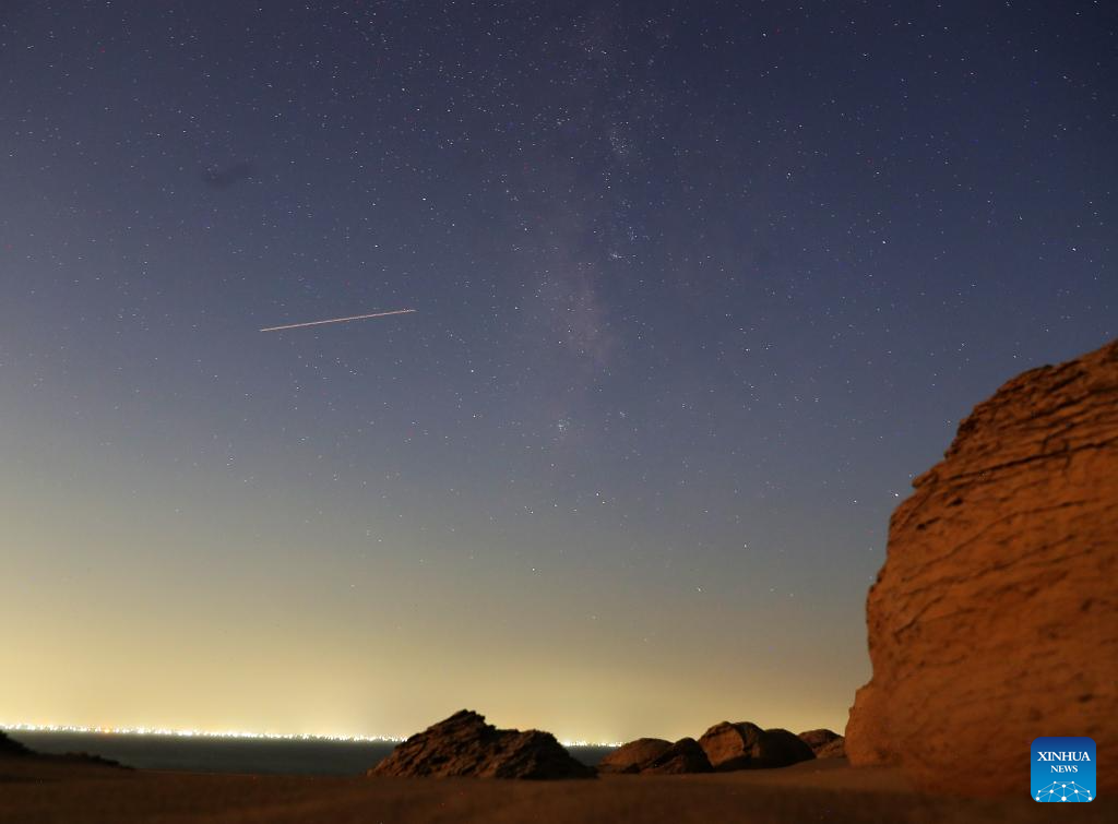 FAYUM, 24 agosto, 2024 (Xinhua) -- Imagen de larga exposición del 23 de agosto de 2024 del cielo estrellado sobre el desierto, en el Valle de la Sandía de Fayum, Egipto. (Xinhua/Yao Bing)