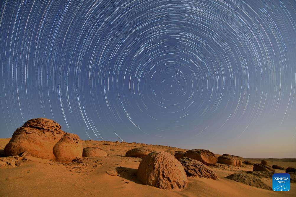 FAYUM, 24 agosto, 2024 (Xinhua) -- Imagen compuesta del 23 de agosto de 2024 de estelas de estrellas sobre el desierto, en el Valle de la Sandía de Fayum, Egipto. (Xinhua/Liu Minhao)