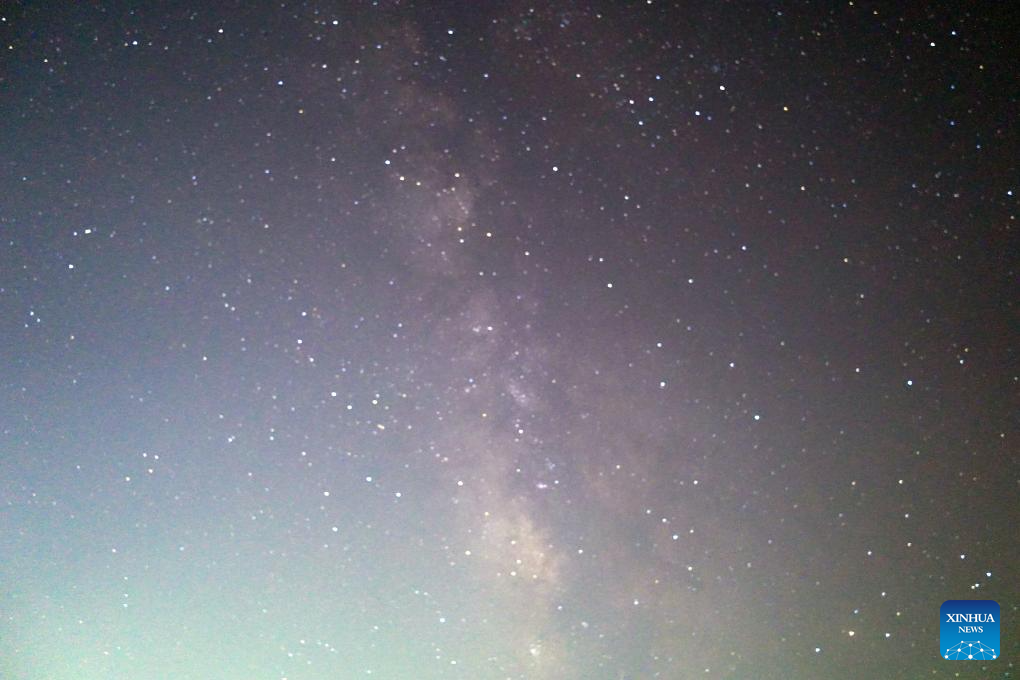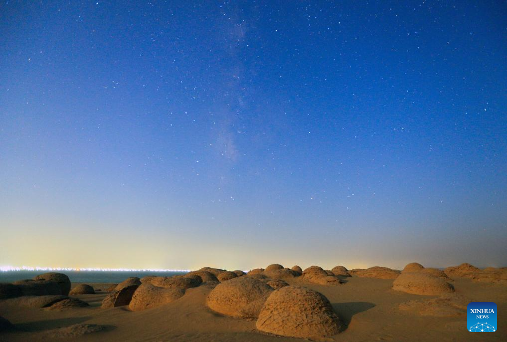 FAYUM, 24 agosto, 2024 (Xinhua) -- Imagen de larga exposición del 23 de agosto de 2024 del cielo estrellado sobre el desierto, en el Valle de la Sandía de Fayum, Egipto. (Xinhua/Wang Dongzhen)