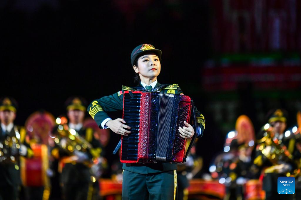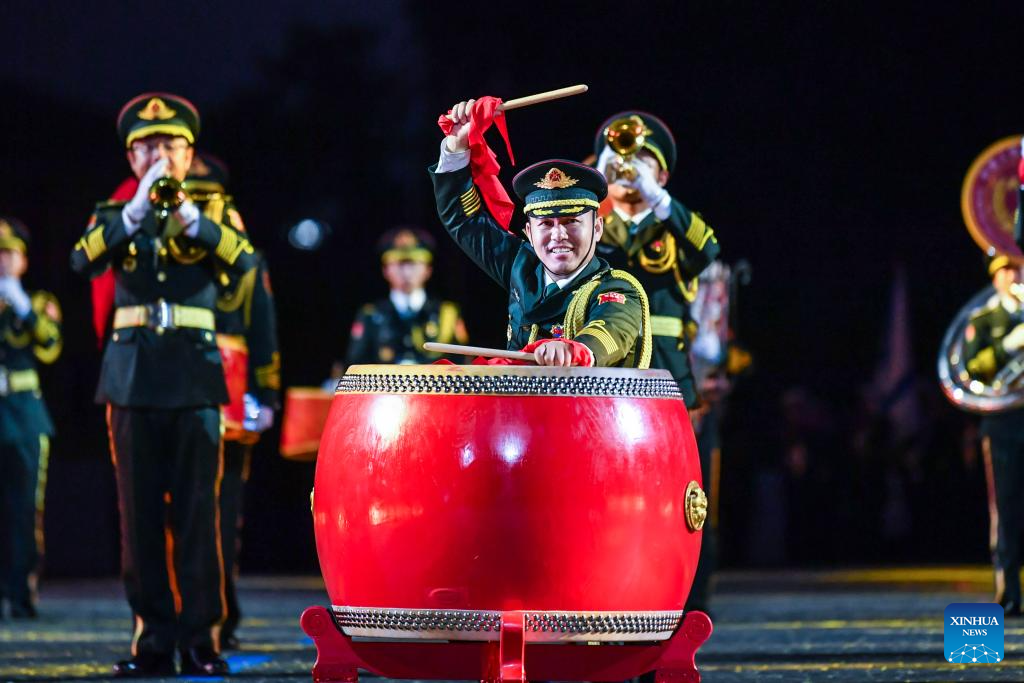 MOSCU, 24 agosto, 2024 (Xinhua) -- Imagen del 23 de agosto de 2024 de miembros de la Banda Militar del Ejército Popular de Liberación (EPL) de China presentándose durante el Festival Internacional de Música Militar "Torre Spasskaya", en Moscú, Rusia. La Banda Militar del EPL de China participó en el 16º Festival Internacional de Música Militar "Torre Spasskaya" por invitación del comité organizador del festival. El festival de música militar fue inaugurado el viernes en la Plaza Roja de Moscú y se extenderá hasta el 1 de septiembre. (Xinhua/Cao Yang)