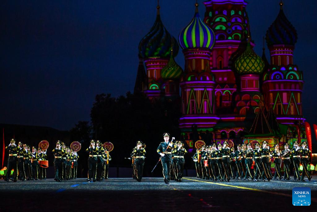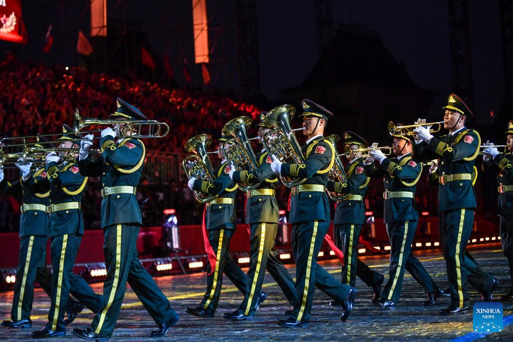 MOSCU, 24 agosto, 2024 (Xinhua) -- Imagen del 23 de agosto de 2024 de miembros de la Banda Militar del Ejército Popular de Liberación (EPL) de China presentándose durante el Festival Internacional de Música Militar "Torre Spasskaya", en Moscú, Rusia. La Banda Militar del EPL de China participó en el 16 Festival Internacional de Música Militar "Torre Spasskaya" por invitación del comité organizador del festival. El festival de música militar fue inaugurado el viernes en la Plaza Roja de Moscú y se extenderá hasta el 1 de septiembre. (Xinhua/Cao Yang)