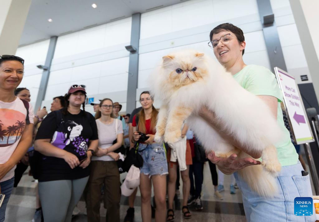 TORONTO, 25 agosto, 2024 (Xinhua) -- Imagen del 24 de agosto de 2024 de una mujer mostrando a su gato mascota durante el Espectáculo de Gatos en la Exposición Nacional Canadiense 2024, en Toronto, Canadá. Más de 100 gatos mascota de todo Canadá participaron en este evento anual del 24 al 25 de agosto. (Xinhua/Zou Zheng)