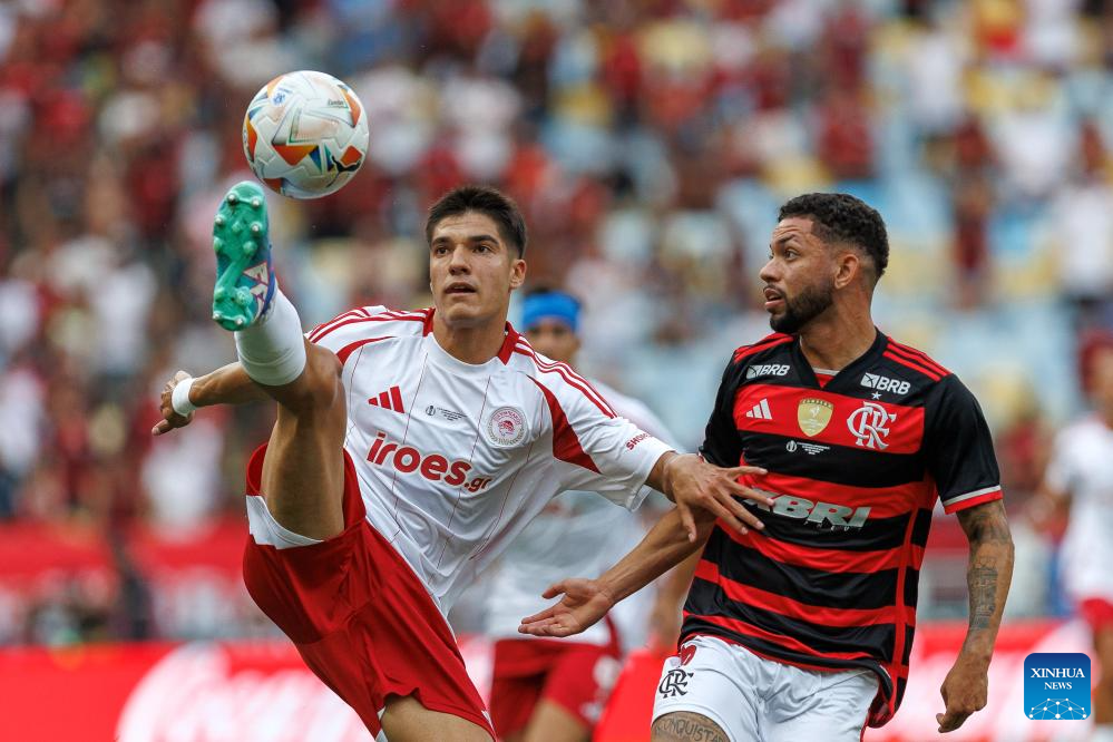 RÍO DE JANEIRO, 25 agosto, 2024 (Xinhua) -- Imagen del 24 de agosto de 2024 del jugador Argyrios Liatsikouras (i), de Olympiacos de Grecia, controlando el balón durante el partido correspondiente a la final de la Copa Intercontinental Sub-20 UEFA-Conmebol 2024, ante Flamengo de Brasil, celebrado en el Estadio Maracaná, en Río de Janeiro, Brasil. (Xinhua/Claudia Martini)
