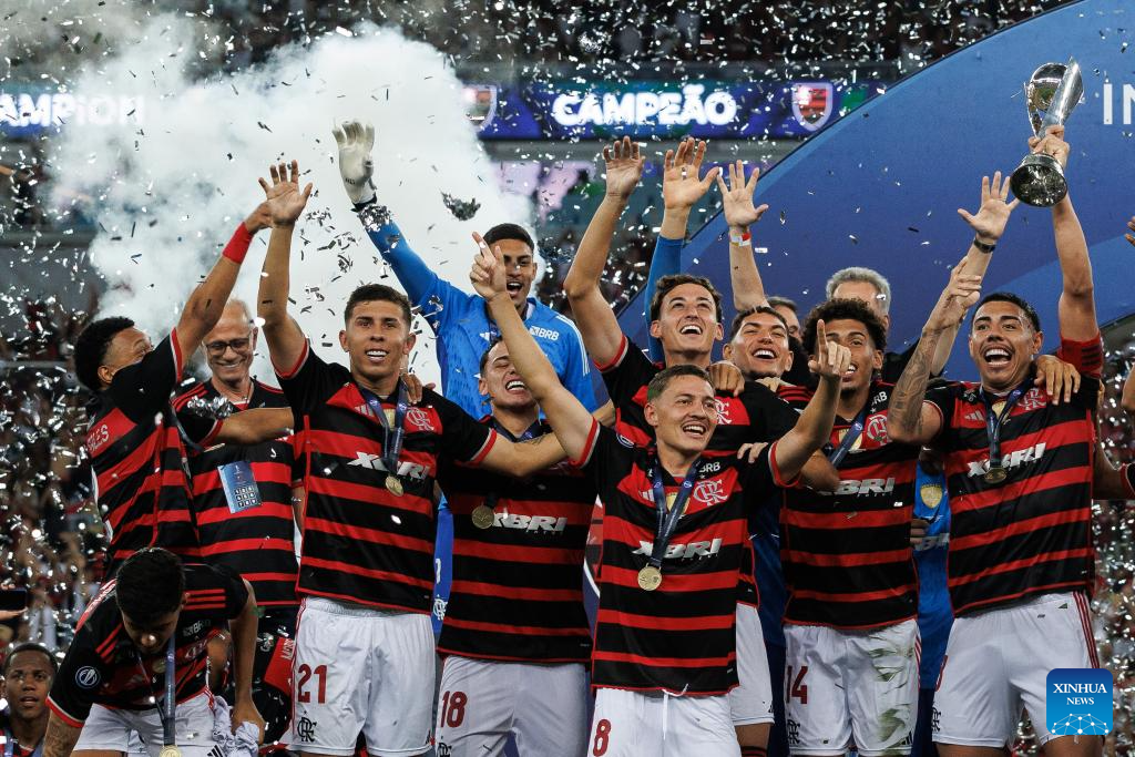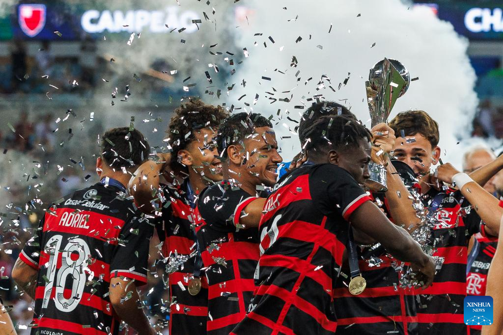 RÍO DE JANEIRO, 25 agosto, 2024 (Xinhua) -- Imagen del 24 de agosto de 2024 de jugadores de Flamengo de Brasil festejando con el trofeo al término del partido correspondiente a la final de la Copa Intercontinental Sub-20 UEFA-Conmebol 2024, ante Olympiacos de Grecia, celebrado en el Estadio Maracaná, en Río de Janeiro, Brasil. (Xinhua/Claudia Martini)