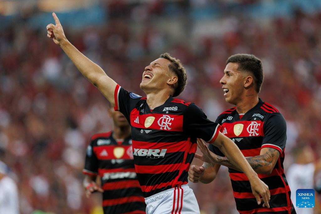 RÍO DE JANEIRO, 25 agosto, 2024 (Xinhua) -- Imagen del 24 de agosto de 2024 del jugador Caio García (i), de Flamengo de Brasil, festejando su anotación durante el partido correspondiente a la final de la Copa Intercontinental Sub-20 UEFA-Conmebol 2024, ante Olympiacos de Grecia, celebrado en el Estadio Maracaná, en Río de Janeiro, Brasil. (Xinhua/Claudia Martini)