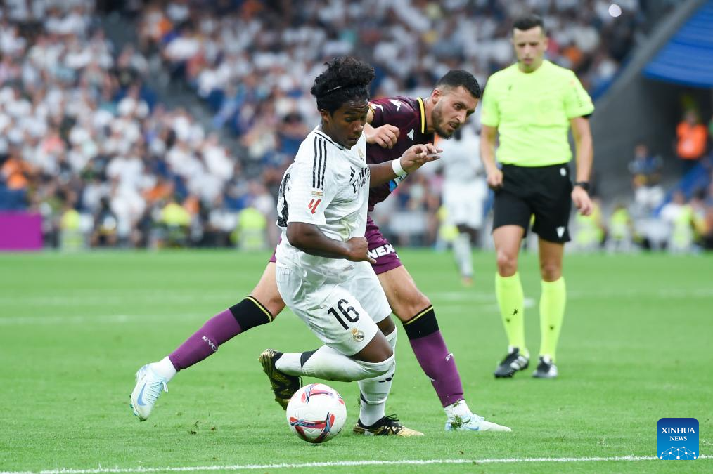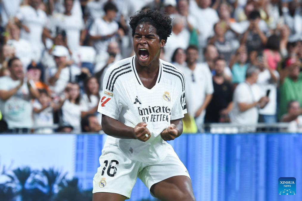 MADRID, 26 agosto, 2024 (Xinhua) -- Imagen del 25 de agosto de 2024 de Endrick, de Real Madrid, festejando su anotación durante el partido de fútbol de La Liga, entre Real Madrid y Real Valladolid, en Madrid, España. (Xinhua/Gustavo Valiente)
