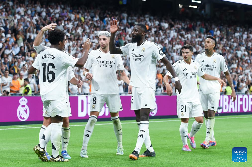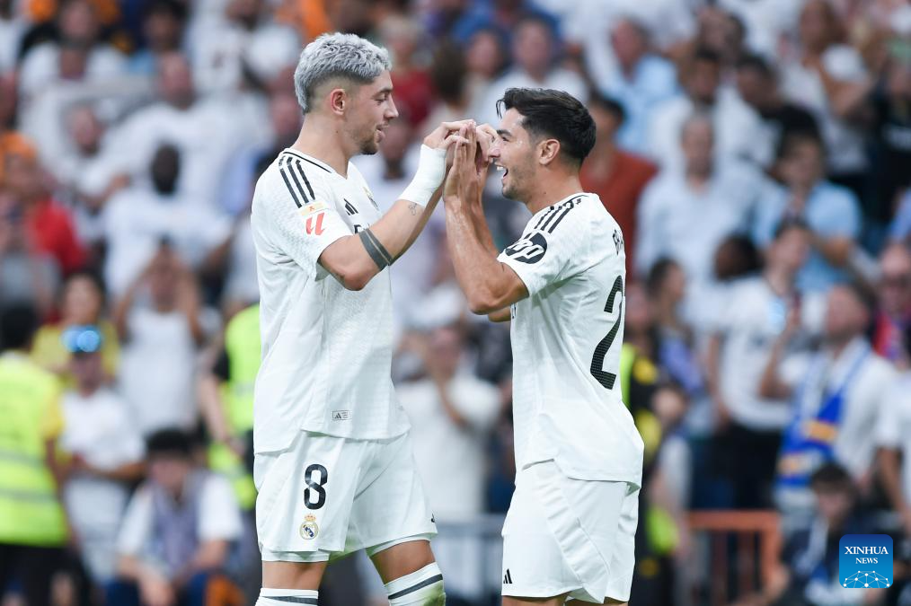 MADRID, 26 agosto, 2024 (Xinhua) -- Imagen del 25 de agosto de 2024 de jugadores de Real Madrid festejando una anotación durante el partido de fútbol de La Liga, entre Real Madrid y Real Valladolid, en Madrid, España. (Xinhua/Gustavo Valiente)