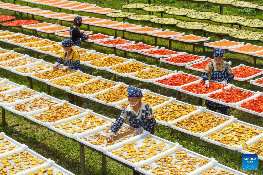 YICHUN, 26 agosto, 2024 (Xinhua) -- Aldeanos secan productos agrícolas, en la aldea Lutian del distrito de Tonggu, en la ciudad de Yichun, en la provincia de Jiangxi, en el este de China, el 26 de agosto de 2024. (Xinhua/Zhou Liang)