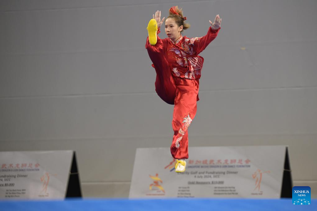 SINGAPUR, 26 agosto, 2024 (Xinhua) -- Debbie Yeung, de Hong Kong de China, compite durante el encuentro del Grupo B de la categoría de Taijiquan estilo Chen femenino (56 movimientos) en el 4º Campeonato Mundial de Taijiquan celebrado en Singapur, el 26 de agosto de 2024. (Xinhua/Then Chih Wey)