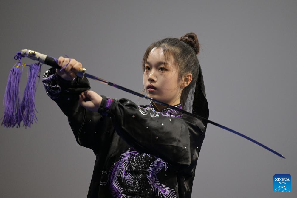 SINGAPUR, 26 agosto, 2024 (Xinhua) -- Priscilla Zou, de Estados Unidos, participa durante la competencia de Taijijian Obligatorio (36 Movimientos) de la IWUF femenina del tercer set en el 4º Campeonato Mundial de Taijiquan celebrado en Singapur, el 26 de agosto de 2024. (Xinhua/Then Chih Wey)