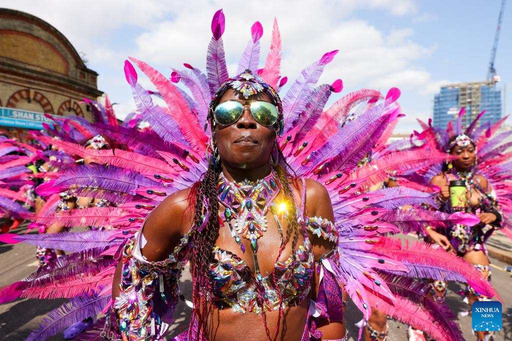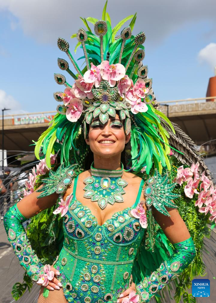 LONDRES, 26 agosto, 2024 (Xinhua) -- Imagen del 26 de agosto de 2024 de una artista participando en el Carnaval de Notting Hill, en Londres, Reino Unido. Originado en la década de 1960, el carnaval es una forma para que las comunidades afrocaribeñas celebren sus culturas y tradiciones. (Xinhua)