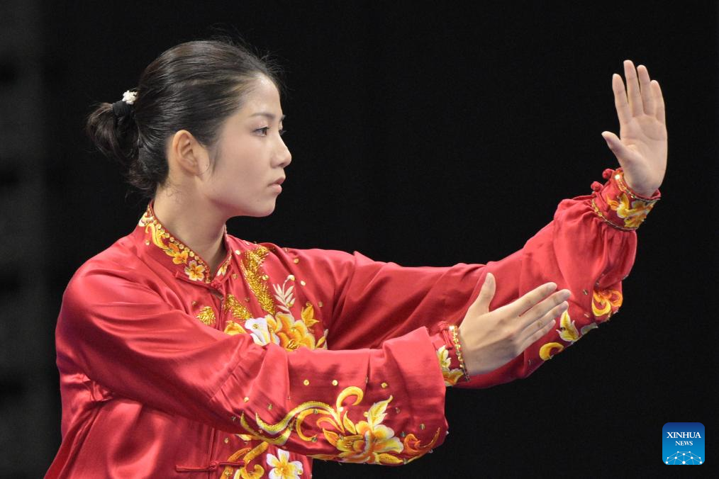 SINGAPUR, 27 agosto, 2024 (Xinhua) -- Kuok Wai Meng, de Macao de China, compite en el tercer set en la categoría de Taijiquan (39 movimientos) femenino en el 4 Campeonato Mundial de Taijiquan, en Singapur, el 27 de agosto de 2024. (Xinhua/Then Chih Wey)