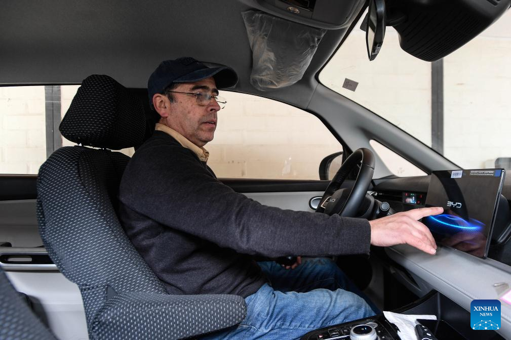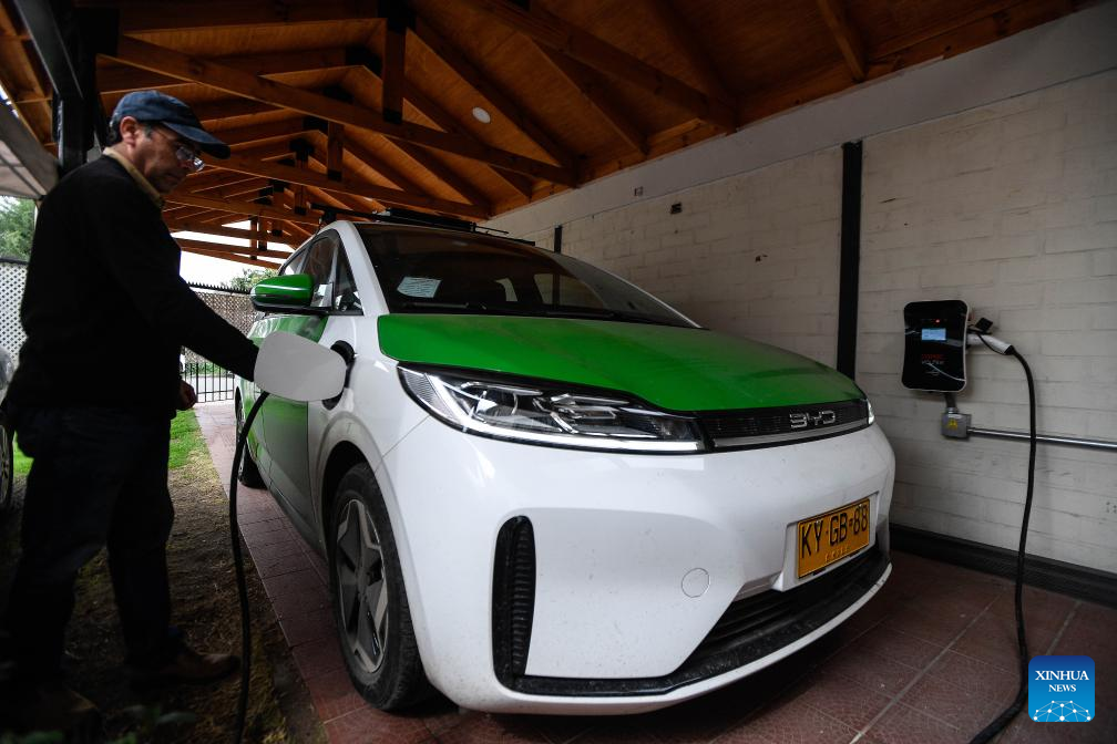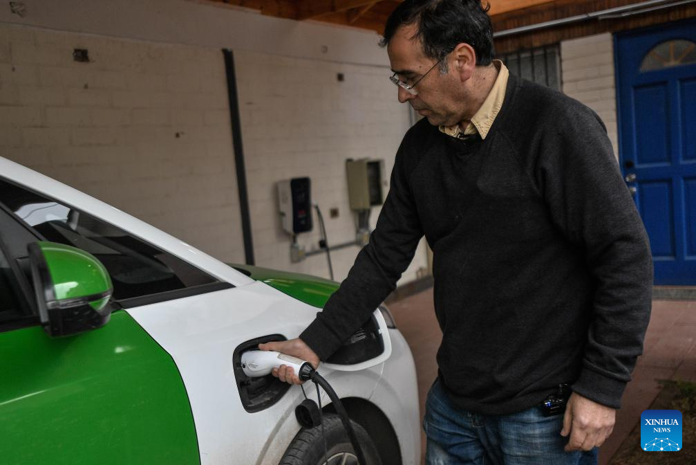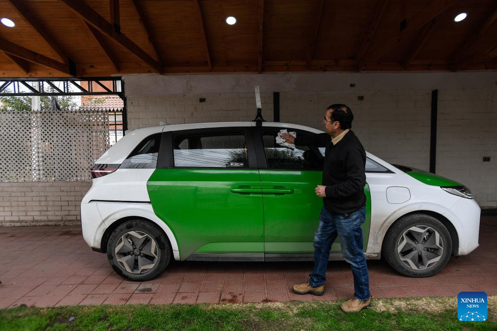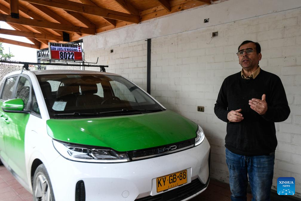 SANTIAGO, 27 ago (Xinhua) -- El conductor chileno Gabriel Garrido muestra con orgullo su auto eléctrico de la marca china BYD, tras participar con éxito en el programa del Gobierno del país sudamericano "Mi taxi eléctrico", que incentiva a cambiar los antiguos autos a combustión por máquinas 100 por ciento eléctricas.