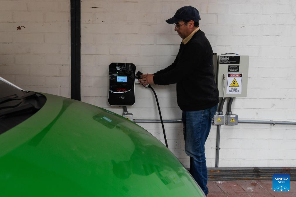 Imagen del 20 de agosto de 2024 del conductor chileno, Gabriel Garrido, cargando un automóvil eléctrico chino después de participar en una entrevista con la Agencia de Noticias Xinhua, en Santiago, capital de Chile. Garrido muestra con orgullo su auto eléctrico de la marca china BYD, tras participar con éxito en el programa del Gobierno del país sudamericano "Mi taxi eléctrico", que incentiva a cambiar los antiguos autos a combustión por máquinas 100 por ciento eléctricas. (Xinhua/Jorge Villegas)