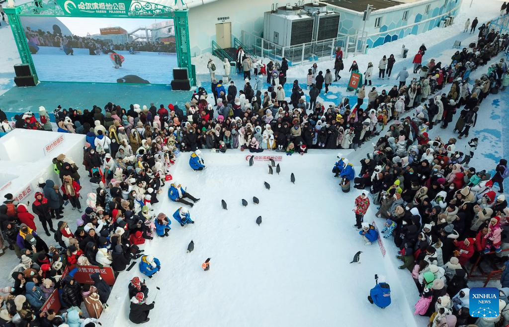 HARBIN, 27 agosto, 2024 (Xinhua) -- Imagen aérea tomada con un dron el 5 de enero de 2024 de turistas observando un desfile de pingüinos en el Parque Polar de Harbin, en Harbin, en la provincia de Heilongjiang, en el noreste de China. Conocida como la "Ciudad de Hielo" de China, Harbin tiene fama de tener un clima fresco y atracciones diversificadas, incluso durante los meses de verano, lo que la ayuda a seguir siendo atractiva para los turistas durante todo el año. (Xinhua/Wang Jianwei)