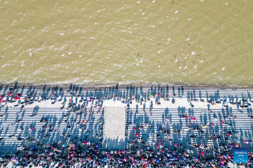 HARBIN, 27 agosto, 2024 (Xinhua) -- Imagen aérea tomada con un dron el 19 de abril de 2024 de personas divirtiéndose a lo largo del río Songhua, en Harbin, en la provincia de Heilongjiang, en el noreste de China. Conocida como la "Ciudad de Hielo" de China, Harbin tiene fama de tener un clima fresco y atracciones diversificadas, incluso durante los meses de verano, lo que la ayuda a seguir siendo atractiva para los turistas durante todo el año. (Xinhua/Zhang Tao)
