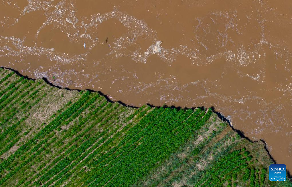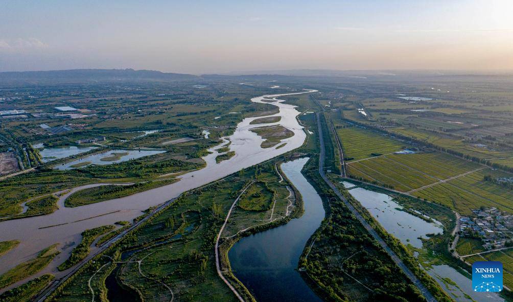 YINCHUAN, 27 agosto, 2024 (Xinhua) -- Vista aérea tomada con un dron el 18 de julio de 2024 de una sección del río Amarillo, en el distrito de Pingluo, en la región autónoma hui de Ningxia, en el noroeste de China. En los últimos años, Ningxia ha concedido gran importancia a la protección y gestión del río Amarillo. La región ha intensificado los esfuerzos para mejorar el entorno ecológico en las zonas de la cuenca del río. (Xinhua/Yang Zhisen)