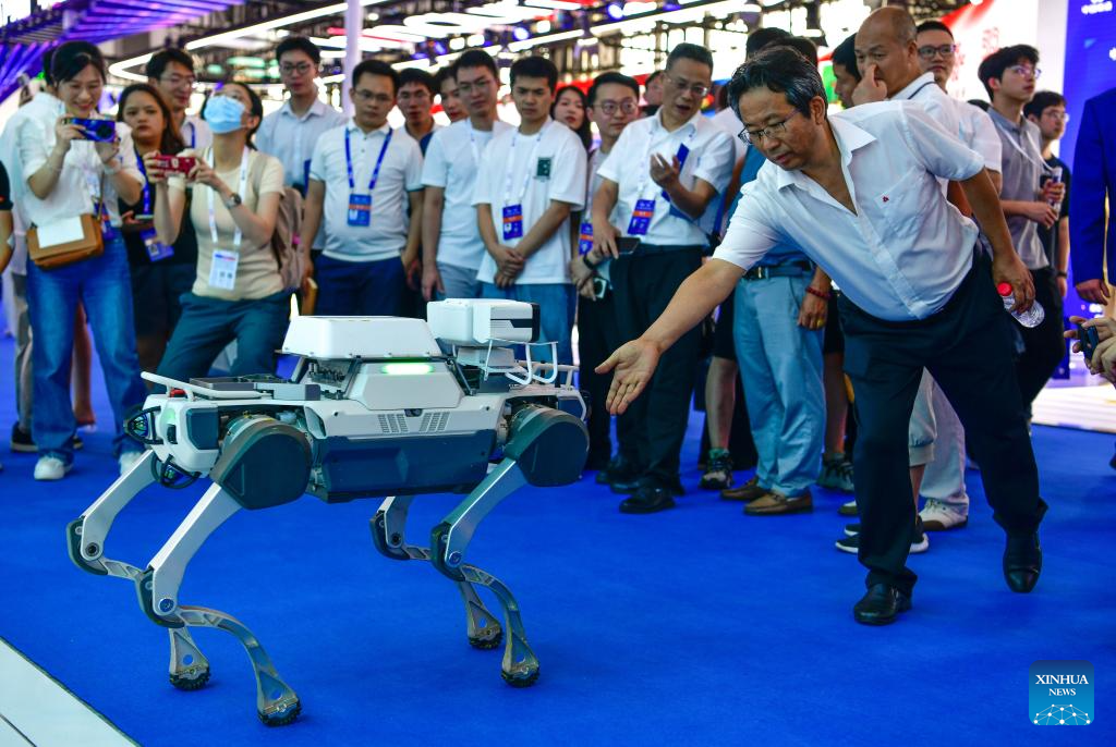 GUIYANG, 28 agosto, 2024 (Xinhua) -- Un visitante interactúa con un perro robot en la Exposición Internacional de la Industria de Macrodatos de China 2024, en Guiyang, en la provincia de Guizhou, en el suroeste de China, el 28 de agosto de 2024. La Exposición Internacional de la Industria de Macrodatos de China 2024 se inauguró el miércoles en Guiyang, con la participación de más de 21.000 visitantes y 414 empresas nacionales e internacionales. Las empresas mostrarán sus tecnologías digitales de vanguardia, soluciones y aplicaciones innovadoras en diversos campos. La muestra de este año, con el lema "La tecnología digital inteligente da forma a una próspera economía digital", ocupa una superficie de exhibición de 60.000 metros cuadrados y consta de seis secciones principales. (Xinhua/Yang Wenbin)