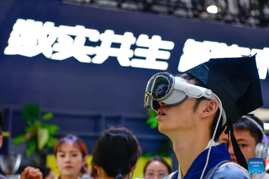 GUIYANG, 28 agosto, 2024 (Xinhua) -- Un visitante prueba un dispositivo de realidad virtual en la Exposición Internacional de la Industria de Macrodatos de China 2024, en Guiyang, en la provincia de Guizhou, en el suroeste de China, el 28 de agosto de 2024. La Exposición Internacional de la Industria de Macrodatos de China 2024 se inauguró el miércoles en Guiyang, con la participación de más de 21.000 visitantes y 414 empresas nacionales e internacionales. Las empresas mostrarán sus tecnologías digitales de vanguardia, soluciones y aplicaciones innovadoras en diversos campos. La muestra de este año, con el lema "La tecnología digital inteligente da forma a una próspera economía digital", ocupa una superficie de exhibición de 60.000 metros cuadrados y consta de seis secciones principales. (Xinhua/Yang Wenbin)