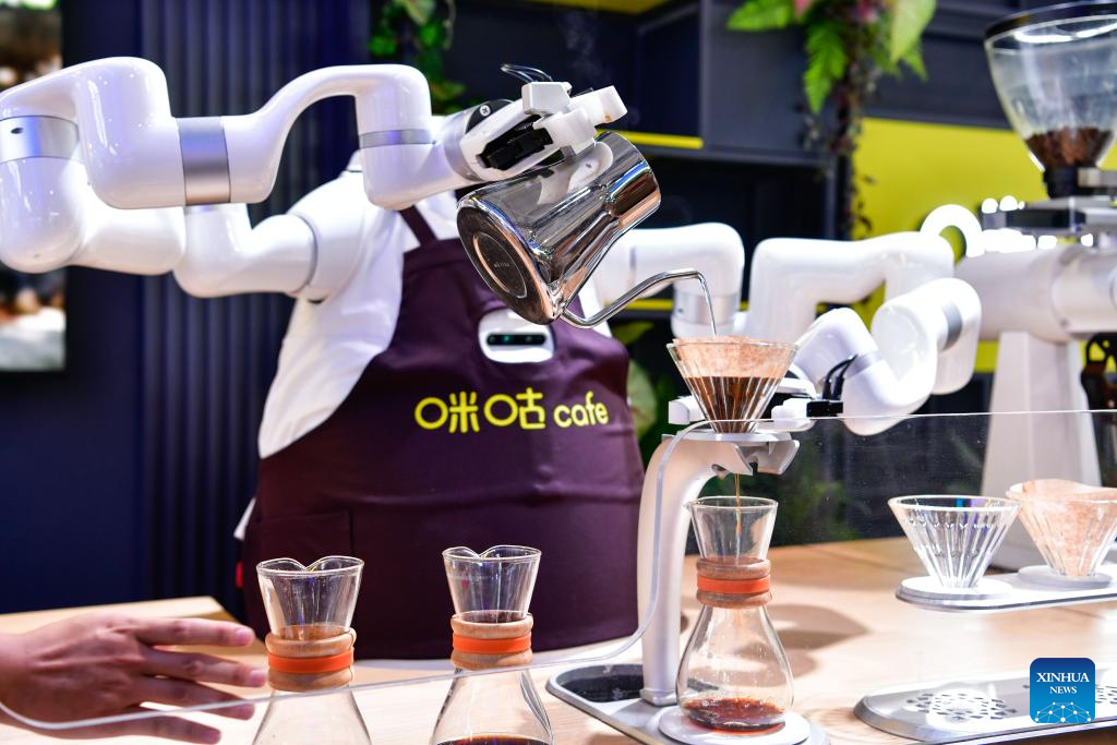 GUIYANG, 28 agosto, 2024 (Xinhua) -- Un robot impulsado por inteligencia artificial prepara café en la Exposición Internacional de la Industria de Macrodatos de China 2024, en Guiyang, en la provincia de Guizhou, en el suroeste de China, el 28 de agosto de 2024. La Exposición Internacional de la Industria de Macrodatos de China 2024 se inauguró el miércoles en Guiyang, con la participación de más de 21.000 visitantes y 414 empresas nacionales e internacionales. Las empresas mostrarán sus tecnologías digitales de vanguardia, soluciones y aplicaciones innovadoras en diversos campos. La muestra de este año, con el lema "La tecnología digital inteligente da forma a una próspera economía digital", ocupa una superficie de exhibición de 60.000 metros cuadrados y consta de seis secciones principales. (Xinhua/Yang Wenbin)
