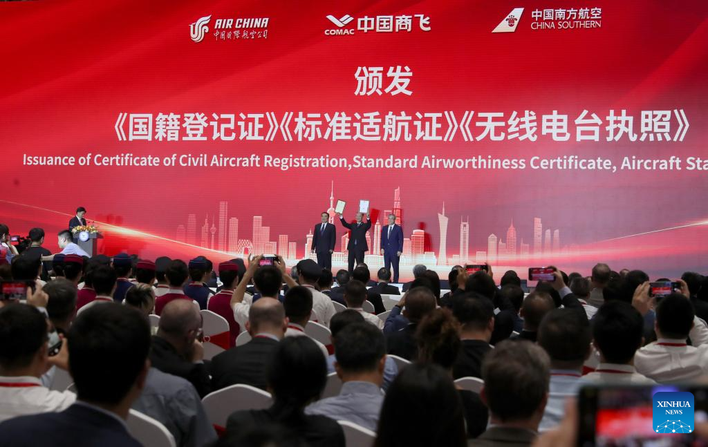 SHANGHAI, 28 agosto, 2024 (Xinhua) -- Imagen del 28 de agosto de 2024 de la ceremonia de entrega del avión de pasajeros de gran tamaño C919 de China en un centro de fabricación de Commercial Aircraft Corporation of China, Ltd. (COMAC, por sus siglas en inglés), en Shanghai, en el este de China. Air China y China Southern Airlines, dos importantes aerolíneas de China, recibieron ambas su primer avión de pasajeros de gran tamaño C919 entregado por COMAC aquí el miércoles. (Xinhua/Fang Zhe)