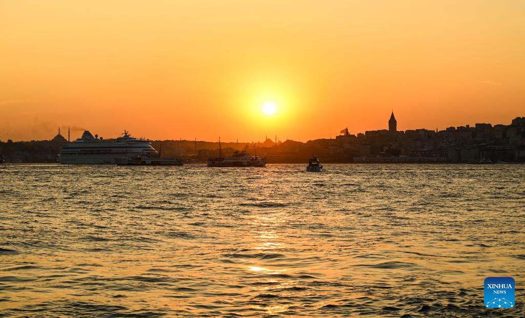 ESTAMBUL, 28 agosto, 2024 (Xinhua) -- Imagen del 27 de agosto de 2024 del Estrecho del Bósforo al atardecer, en Estambul, Turquía. (Xinhua/Liu Lei)