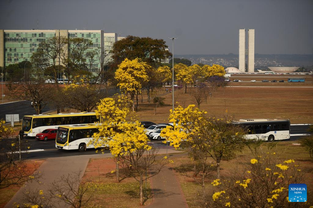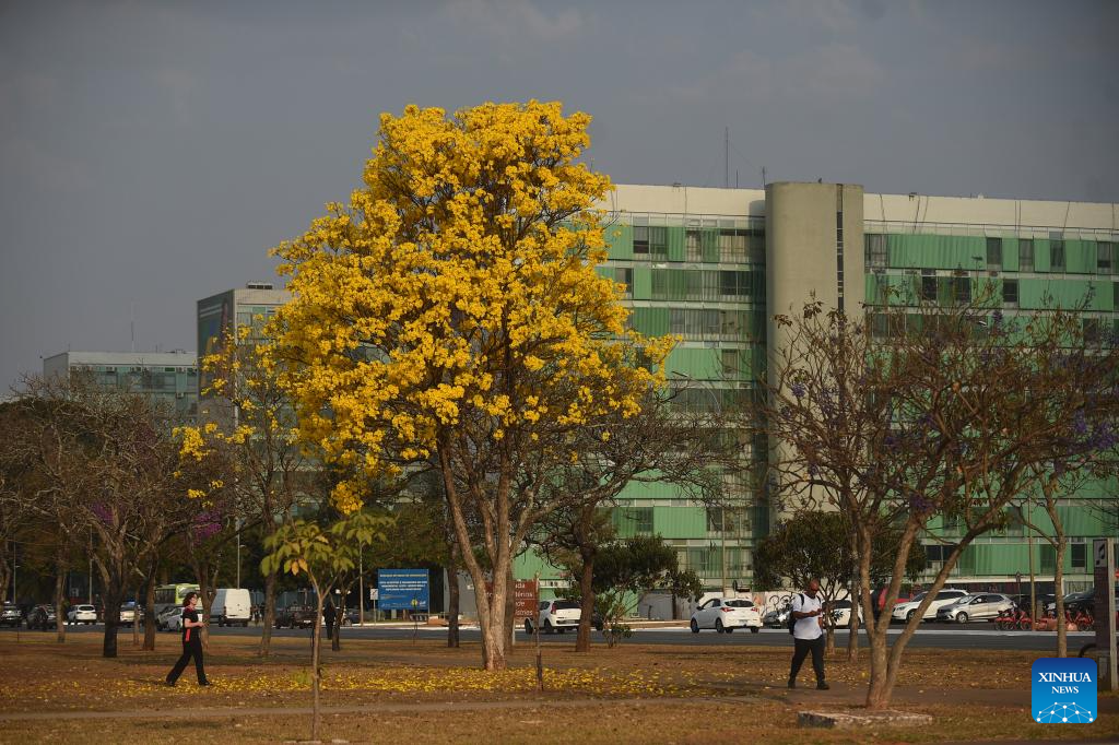 BRASILIA, 27 agosto, 2024 (Xinhua) -- Arboles de ipé amarillo son vistos en la zona central de Brasilia, Brasil, el 27 de agosto de 2024. (Xinhua/Lucio Tavora)