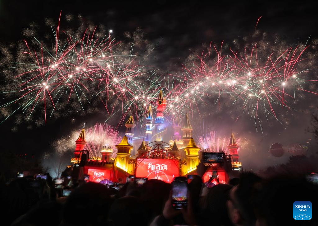 BEIJING, 28 agosto, 2024 (Xinhua) -- Imagen del 1 de enero de 2024 de fuegos artificiales sobre Fantawild Adventure, en Shenyang, en la provincia de Liaoning, en el noreste de China. En los últimos años, la pujante economía nocturna en la región noreste de China ofrece a los habitantes locales y a los turistas opciones de vida nocturna coloridas, lo que ha impulsado el crecimiento de la economía local. (Xinhua/Long Lei)
