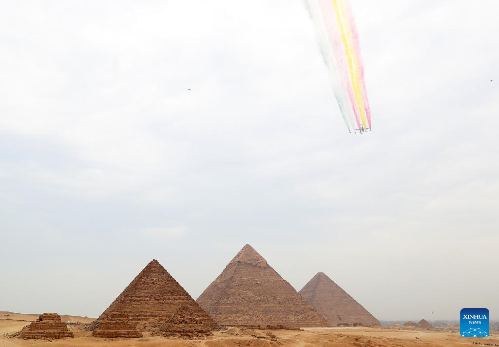 CAIRO, 28 agosto, 2024 (Xinhua) -- Un Y-20, avión de transporte de gran tamaño desarrollado domésticamente por China, y aviones de combate furtivos J-10 del Equipo Acrobático Bayi vuelan sobre el punto escénico de las Pirámides de Giza, en Giza, Egipto, el 28 de agosto de 2024. La formación de vuelo se encuentra en Egipto para un espectáculo aéreo, programado del 3 al 5 de septiembre. (Xinhua/Wang Dongzhen)
