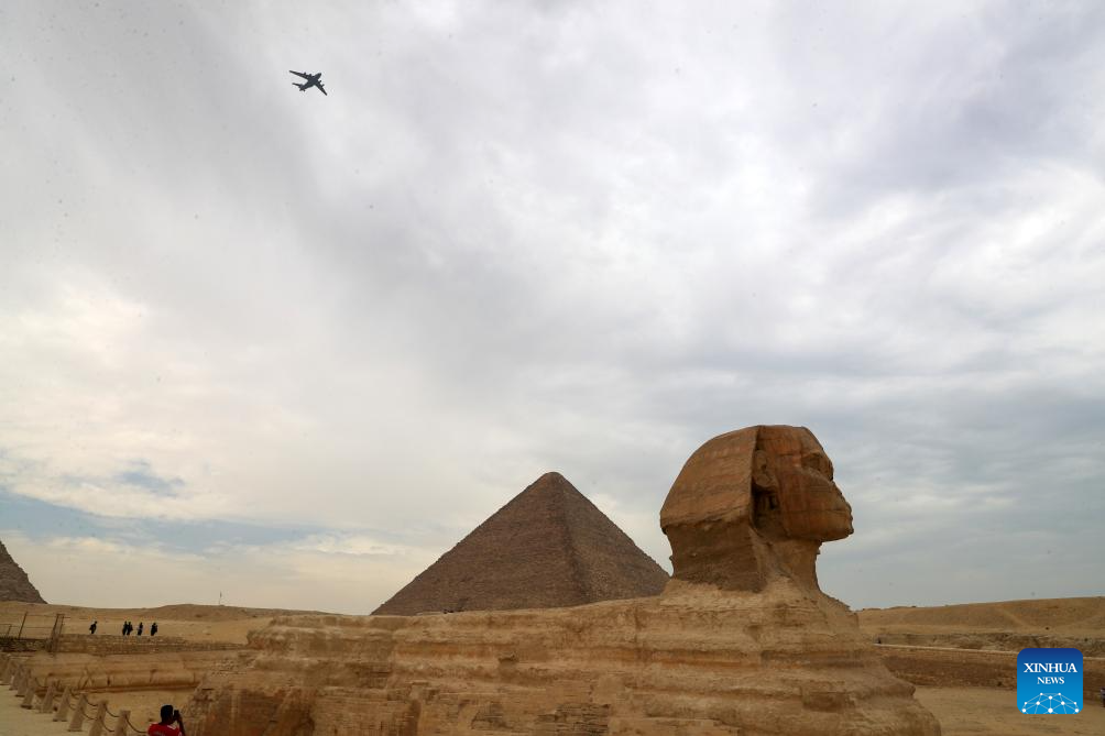 Egipto: Flota de Fuerza Aérea china vuela sobre el punto escénico de las Pirámides de Giza
