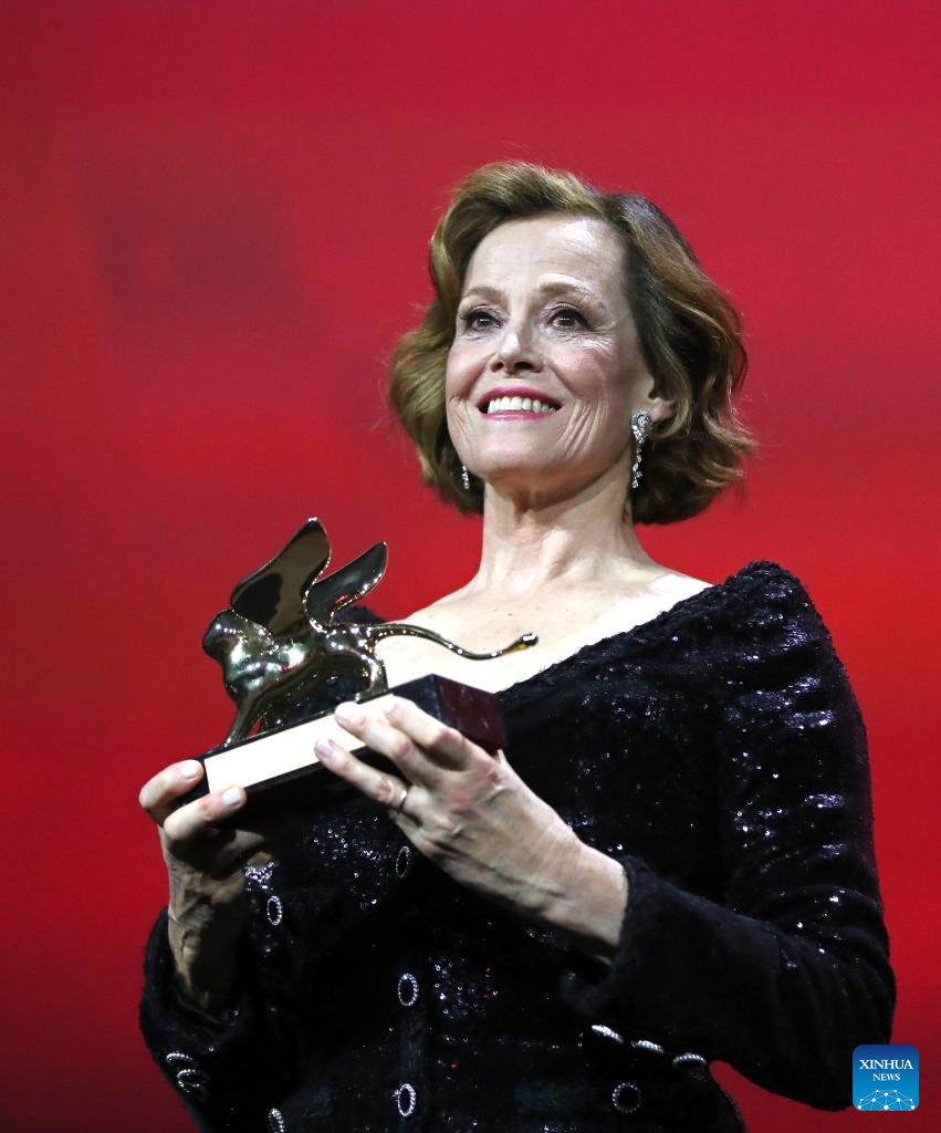 VENECIA, 29 agosto, 2024 (Xinhua) -- Imagen del 28 de agosto de 2024 de Sigourney Weaver posando para una fotografía con el trofeo durante la ceremonia de apertura del 81 Festival de Cine de Venecia, en Venecia, Italia. La actriz estadounidense Sigourney Weaver fue premiada con el León de Oro por trayectoria del 81 Festival de Cine de Venecia, que comenzó el miércoles. (Xinhua/Li Jing)