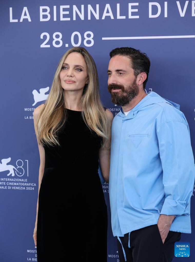 VENECIA, 29 agosto, 2024 (Xinhua) -- Angelina Jolie (i) y Pablo Larraín de la película "Maria" posan para la sesión fotográfica durante el 81 Festival Internacional de Cine de Venecia, en Venecia, Italia, el 29 de agosto de 2024. (Xinhua/Li Jing)