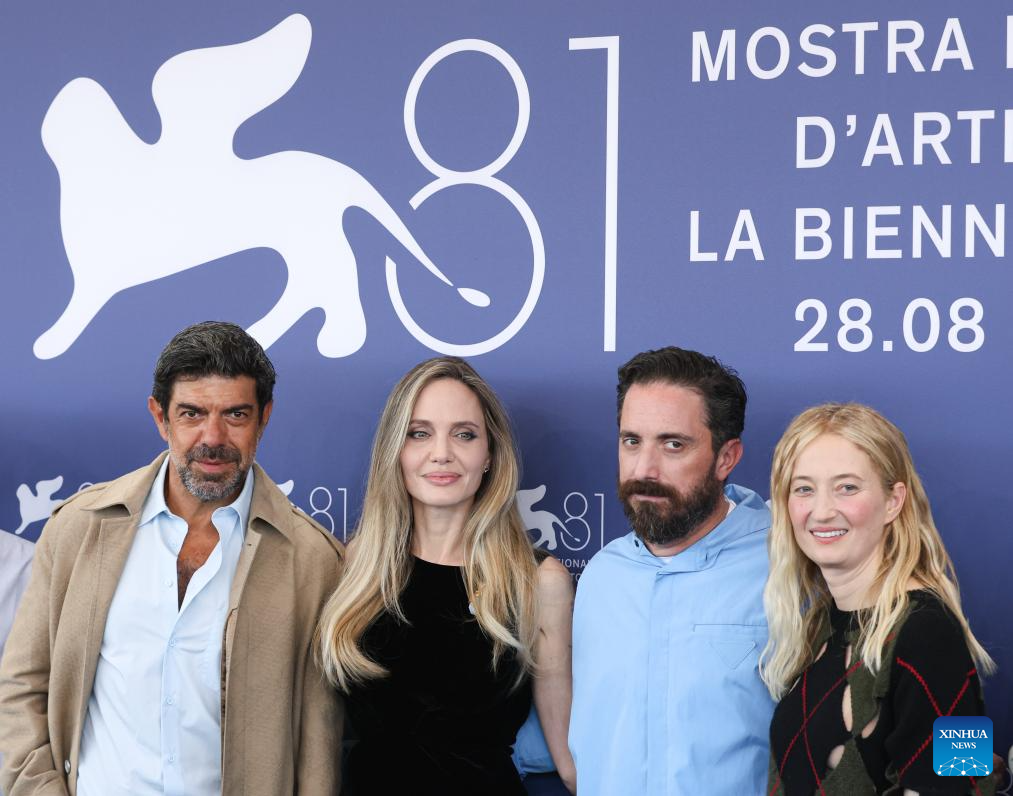 VENECIA, 29 agosto, 2024 (Xinhua) -- (De izq. a der.) Pierfrancesco Favino, Angelina Jolie, Pablo Larraín y Alba Rohrwacher de la película "Maria" posan para la sesión fotográfica durante el 81 Festival Internacional de Cine de Venecia, en Venecia, Italia, el 29 de agosto de 2024. (Xinhua/Li Jing)