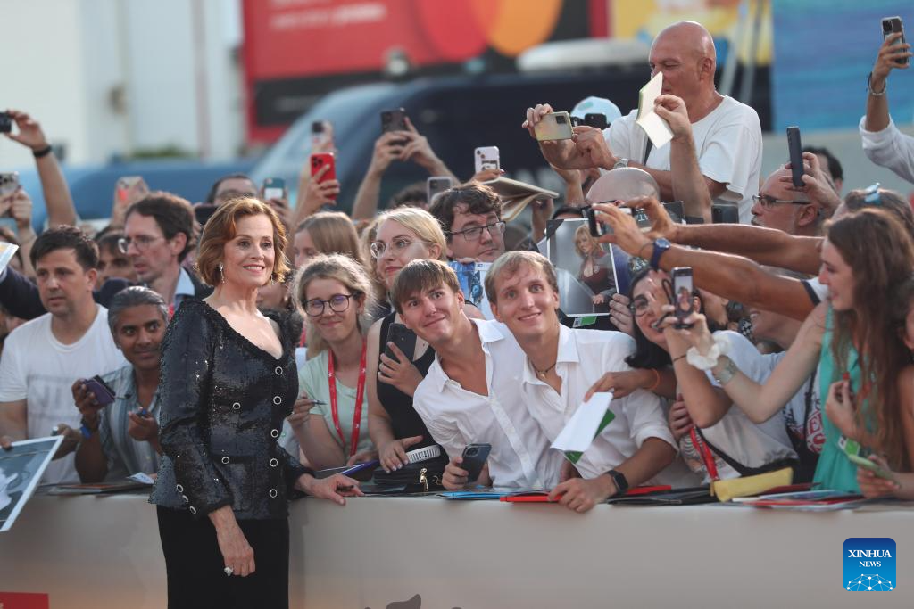 VENECIA, 29 agosto, 2024 (Xinhua) -- Imagen del 28 de agosto de 2024 de Sigourney Weaver interactuando con aficionados después de la ceremonia de apertura del 81 Festival de Cine de Venecia, en Venecia, Italia. La actriz estadounidense Sigourney Weaver fue premiada con el León de Oro por trayectoria del 81 Festival de Cine de Venecia, que comenzó el miércoles. (Xinhua/Li Jing)