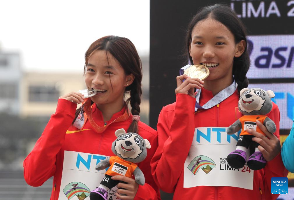 LIMA, 30 agosto, 2024 (Xinhua) -- La medallista de plata Chen Meiling (i) y la medallista de oro Baima Zhuoma (d), de China, posan en la ceremonia de premiación de 10,000 metros marcha femenino durante el XX Campeonato Mundial de Atletismo Sub-20 Lima 2024 (World Athletics U20 Championships 2024) en la Villa Deportiva Nacional, en Lima, Perú, el 30 de agosto de 2024. El evento se realizará hasta el 31 de agosto. (Xinhua/Mariana Bazo)