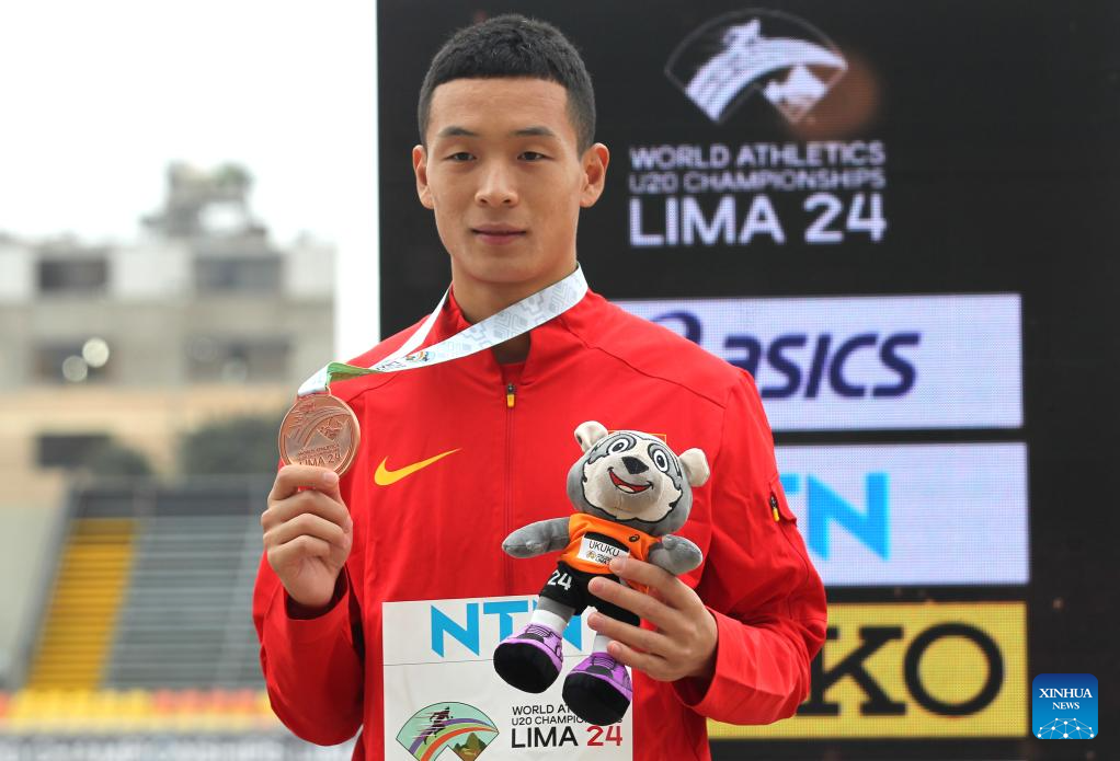 LIMA, 30 agosto, 2024 (Xinhua) -- El medallista de bronce Ma Yinglong, de China, posa en la ceremonia de premiación de triple salto masculino durante el XX Campeonato Mundial de Atletismo Sub-20 Lima 2024 (World Athletics U20 Championships 2024) en la Villa Deportiva Nacional, en Lima, Perú, el 30 de agosto de 2024. El evento se realizará hasta el 31 de agosto. (Xinhua/Mariana Bazo)