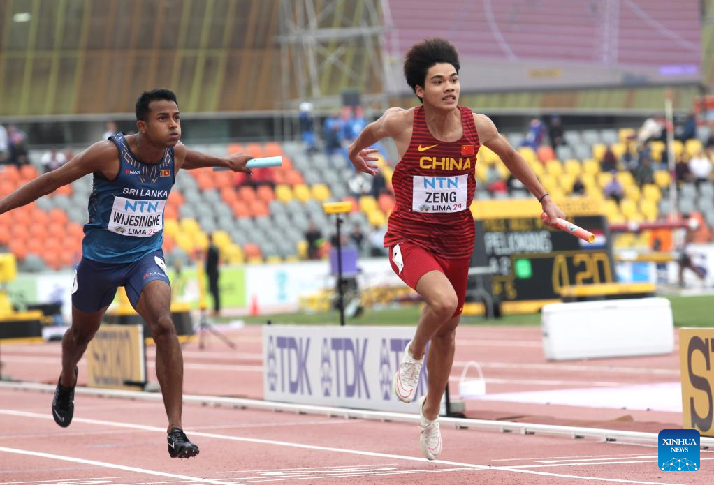 LIMA, 30 agosto, 2024 (Xinhua) -- Zeng Keli (d), de China, compite en la serie de clasificación de 4-100 metros de relevo masculino durante el XX Campeonato Mundial de Atletismo Sub-20 Lima 2024 (World Athletics U20 Championships 2024) en la Villa Deportiva Nacional, en Lima, Perú, el 30 de agosto de 2024. El evento se realizará hasta el 31 de agosto. (Xinhua/Mariana Bazo)