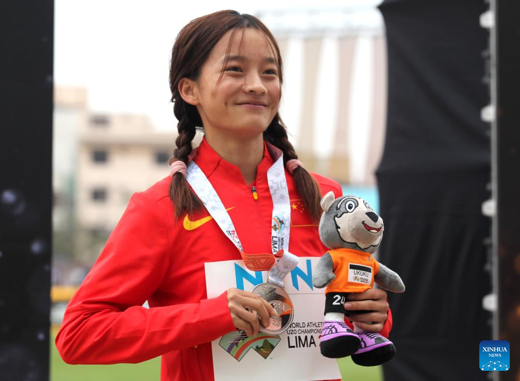 LIMA, 30 agosto, 2024 (Xinhua) -- La medallista de plata Chen Meiling, de China, sonríe en la ceremonia de premiación de 10,000 metros marcha femenino durante el XX Campeonato Mundial de Atletismo Sub-20 Lima 2024 (World Athletics U20 Championships 2024) en la Villa Deportiva Nacional, en Lima, Perú, el 30 de agosto de 2024. El evento se realizará hasta el 31 de agosto. (Xinhua/Mariana Bazo)