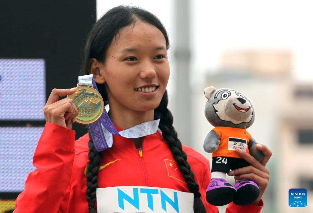 LIMA, 30 agosto, 2024 (Xinhua) -- La medallista de oro Baima Zhuoma, de China, posa en la ceremonia de premiación de 10,000 metros marcha femenino durante el XX Campeonato Mundial de Atletismo Sub-20 Lima 2024 (World Athletics U20 Championships 2024) en la Villa Deportiva Nacional, en Lima, Perú, el 30 de agosto de 2024. El evento se realizará hasta el 31 de agosto. (Xinhua/Mariana Bazo)