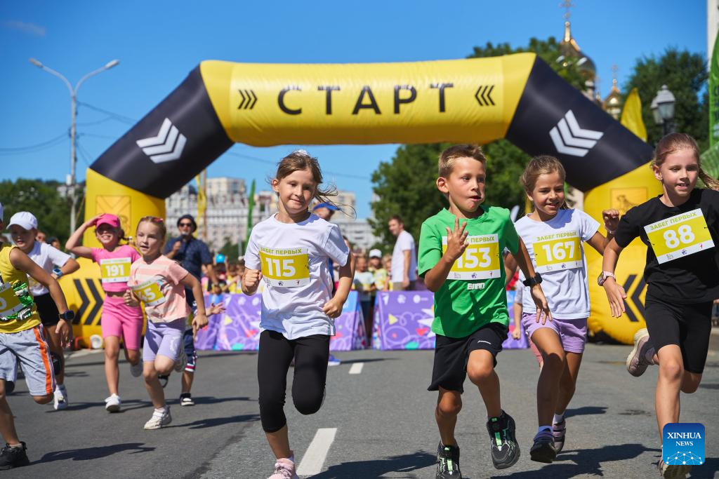 VLADIVOSTOK, 31 agosto, 2024 (Xinhua) -- Niños de primer año participan en una competencia denominada "Primera Carrera" durante un evento por el Día del Conocimiento, en Vladivostok, Rusia, el 31 de agosto de 2024. El evento por el Día del Conocimiento se llevó a cabo el sábado en Vladivostok para celebrar el comienzo del nuevo año escolar. El evento que incluye deportes, arte y juegos, atrajo a muchos niños. (Xinhua/Guo Feizhou)