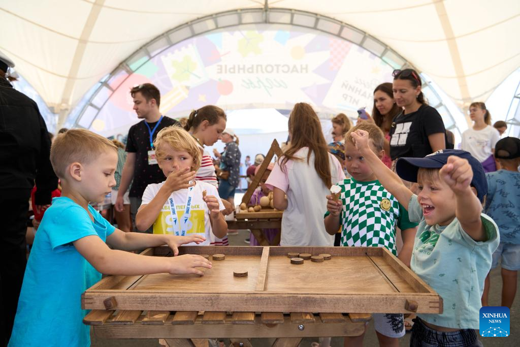 VLADIVOSTOK, 31 agosto, 2024 (Xinhua) -- Niños juegan un juego de mesa durante un evento por el Día del Conocimiento, en Vladivostok, Rusia, el 31 de agosto de 2024. El evento por el Día del Conocimiento se llevó a cabo el sábado en Vladivostok para celebrar el comienzo del nuevo año escolar. El evento que incluye deportes, arte y juegos, atrajo a muchos niños. (Xinhua/Guo Feizhou)