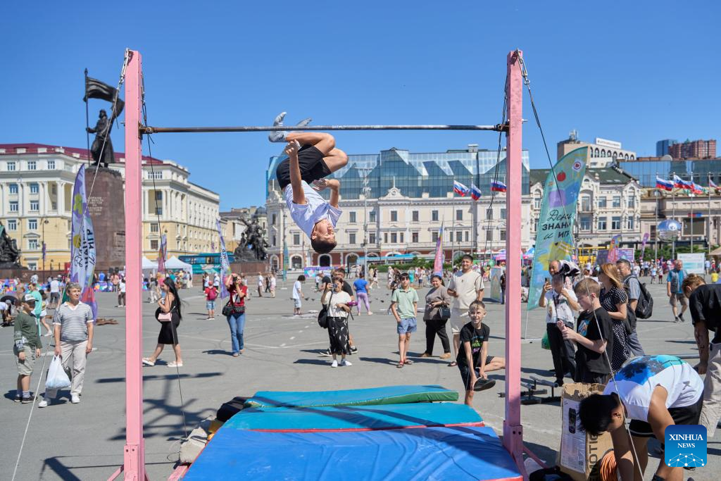 VLADIVOSTOK, 31 agosto, 2024 (Xinhua) -- Un niño demuestra sus habilidades en la barra horizontal durante un evento por el Día del Conocimiento, en Vladivostok, Rusia, el 31 de agosto de 2024. El evento por el Día del Conocimiento se llevó a cabo el sábado en Vladivostok para celebrar el comienzo del nuevo año escolar. El evento que incluye deportes, arte y juegos, atrajo a muchos niños. (Xinhua/Guo Feizhou)