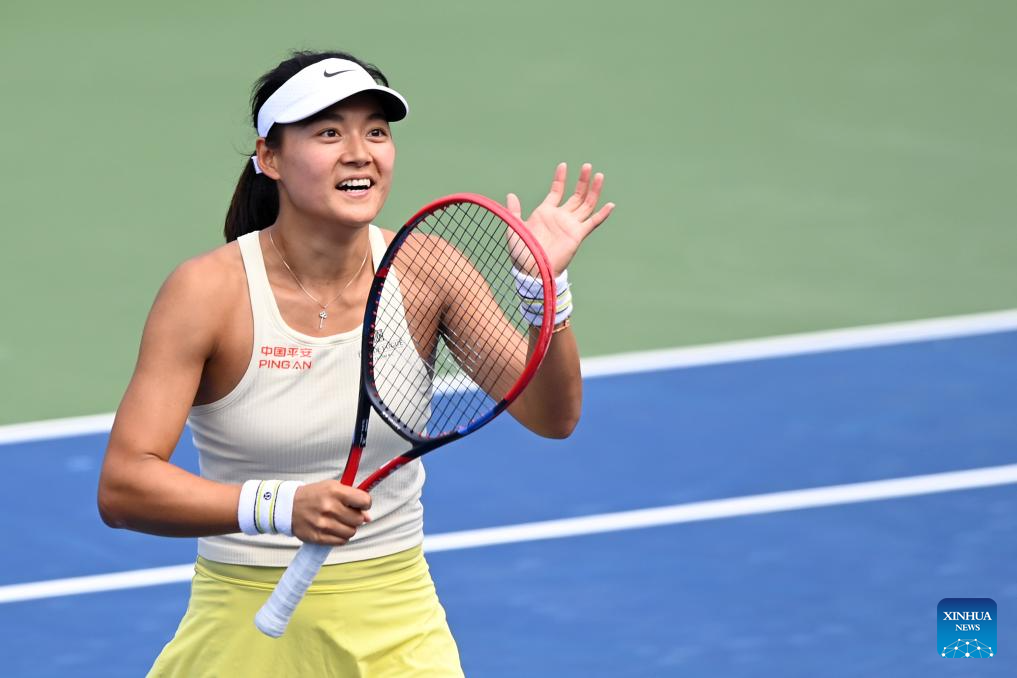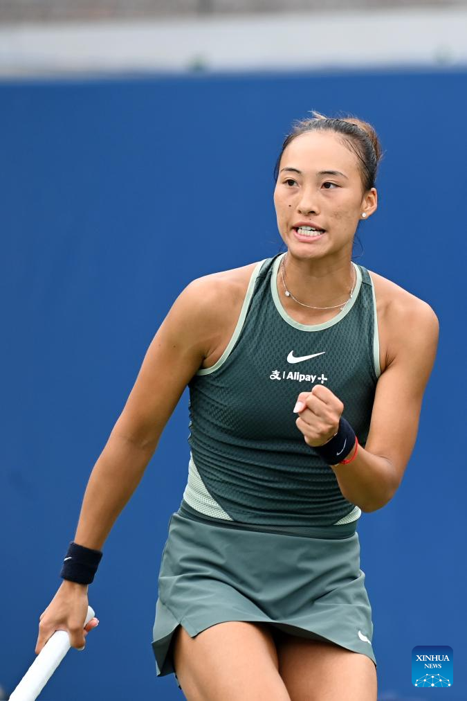 NUEVA YORK, 31 agosto, 2024 (Xinhua) -- Imagen del 30 de agosto de 2024 de Zheng Qinwen de China festejando durante partido de tercera ronda de individuales femeninos entre Zheng Qinwen de China y Jule Niemeier de Alemania en el campeonato de tenis US Open 2024, en Nueva York, Estados Unidos. (Xinhua/Li Rui)