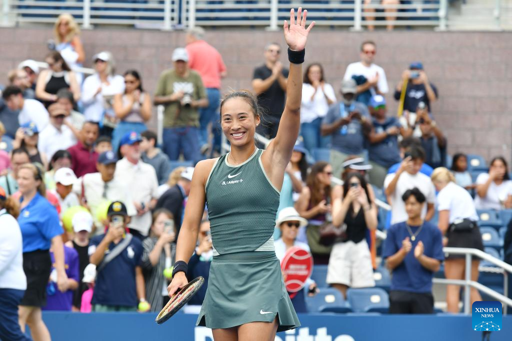 NUEVA YORK, 31 agosto, 2024 (Xinhua) -- Imagen del 30 de agosto de 2024 de Zheng Qinwen de China festejando al término del partido de tercera ronda de individuales femeninos entre Zheng Qinwen de China y Jule Niemeier de Alemania en el campeonato de tenis US Open 2024, en Nueva York, Estados Unidos. (Xinhua/Li Rui)