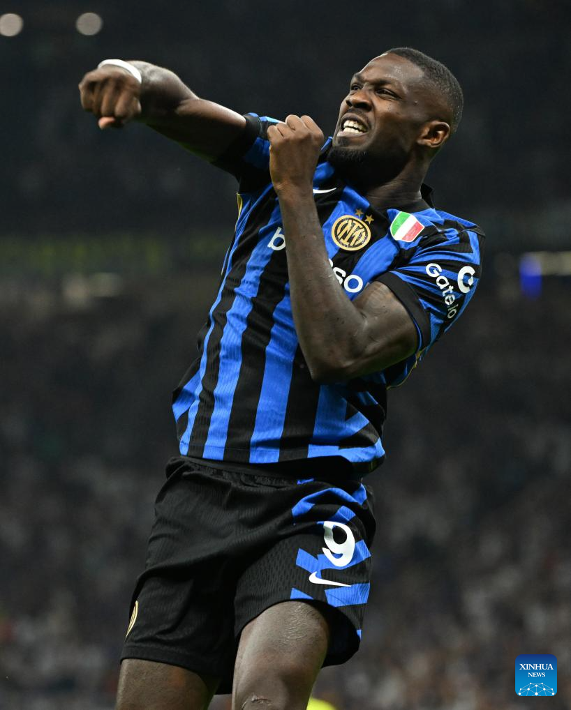 MILAN, 31 agosto, 2024 (Xinhua) -- Imagen del 30 de agosto de 2024 de Marcus Thuram, de Inter de Milán, festejando su anotación durante el partido correspondiente a la Serie A entre Inter de Milán y Atalanta, en Milán, Italia. (Xinhua/Alberto Lingria)