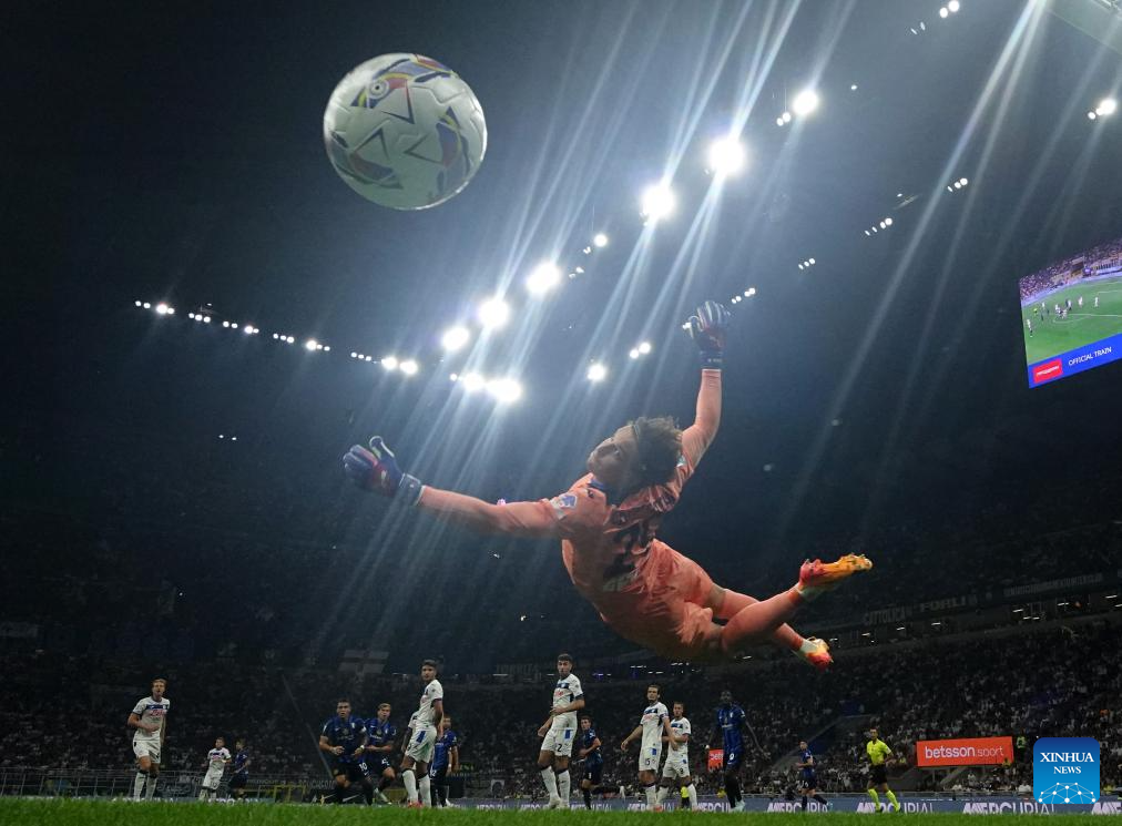 MILAN, 31 agosto, 2024 (Xinhua) -- Imagen del 30 de agosto de 2024 del guardameta Mark Carnesecchi (frente) de Atalanta fallando al intentar atajar la anotación de Nicolo Barella, de Inter de Milán, durante el partido correspondiente a la Serie A entre Inter de Milán y Atalanta, en Milán, Italia. (Xinhua/Alberto Lingria)