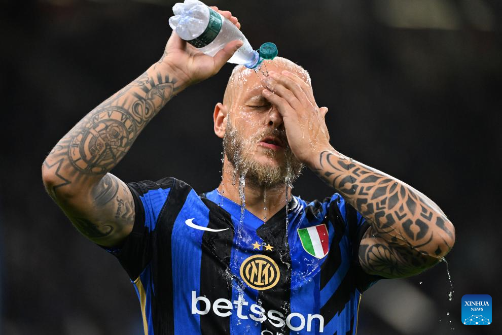 MILAN, 31 agosto, 2024 (Xinhua) -- Imagen del 30 de agosto de 2024 de Federico Dimarco, de Inter de Milán, refrescándose previo al partido correspondiente a la Serie A entre Inter de Milán y Atalanta, en Milán, Italia. (Xinhua/Alberto Lingria)