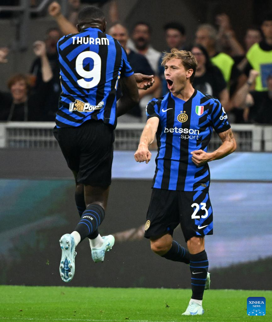 MILAN, 31 agosto, 2024 (Xinhua) -- Imagen del 30 de agosto de 2024 de Nicolo Barella (d), de Inter de Milán, festejando su anotación junto a su compañero Marcus Thuram durante el partido correspondiente a la Serie A entre Inter de Milán y Atalanta, en Milán, Italia. (Xinhua/Alberto Lingria)