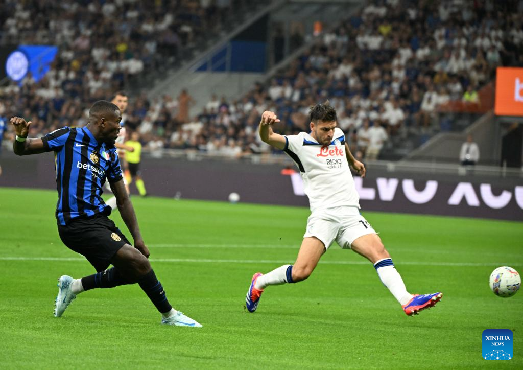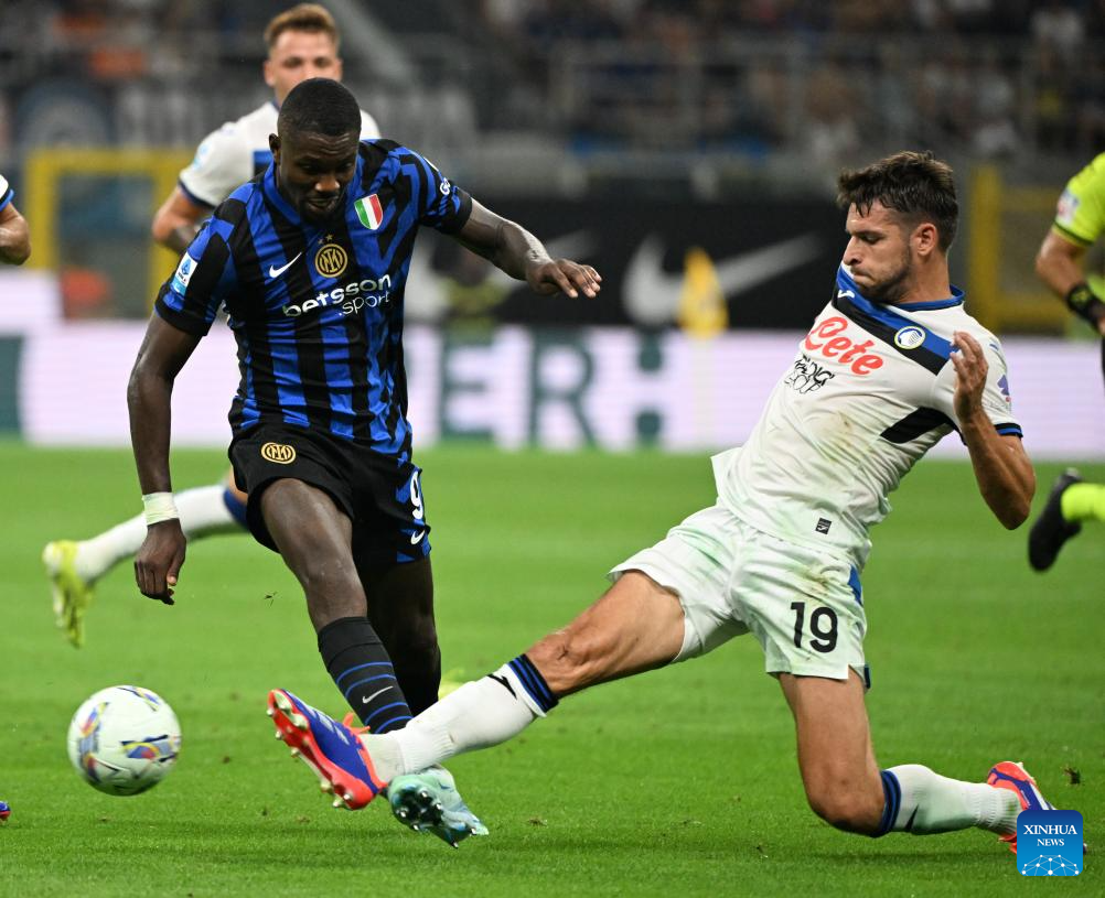 MILAN, 31 agosto, 2024 (Xinhua) -- Imagen del 30 de agosto de 2024 de Marcus Thuram (i), de Inter de Milán, disputando el balón con Berat Djimsiti, de Atalanta, durante el partido correspondiente a la Serie A entre Inter de Milán y Atalanta, en Milán, Italia. (Xinhua/Alberto Lingria)